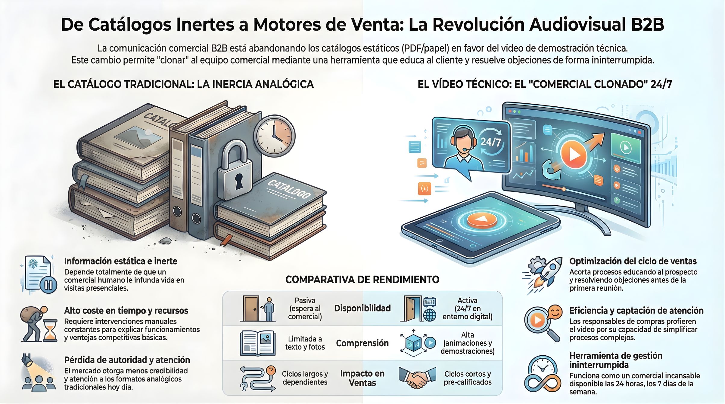 El catálogo tradicional, mudo y carente de dinamismo, requiere ineludiblemente de la intervención activa (y costosa en tiempo) de un representante de ventas para explicar el funcionamiento, las ventajas competitivas y la ingeniería detrás de una maquinaria o software. Por el contrario, la comunicación audiovisual en el entorno digital viene caracterizada por operar como un comercial incansable que trabaja 24 horas al día, 7 días a la semana. Un vídeo técnico bien estructurado acorta drásticamente el ciclo de ventas al educar al prospecto, resolver objeciones técnicas por adelantado y calificar al cliente antes incluso de la primera reunión presencial.